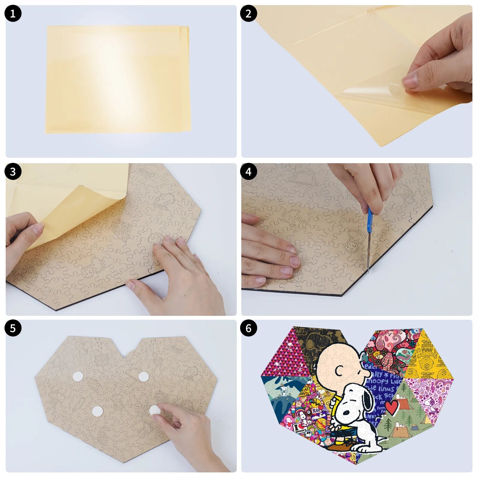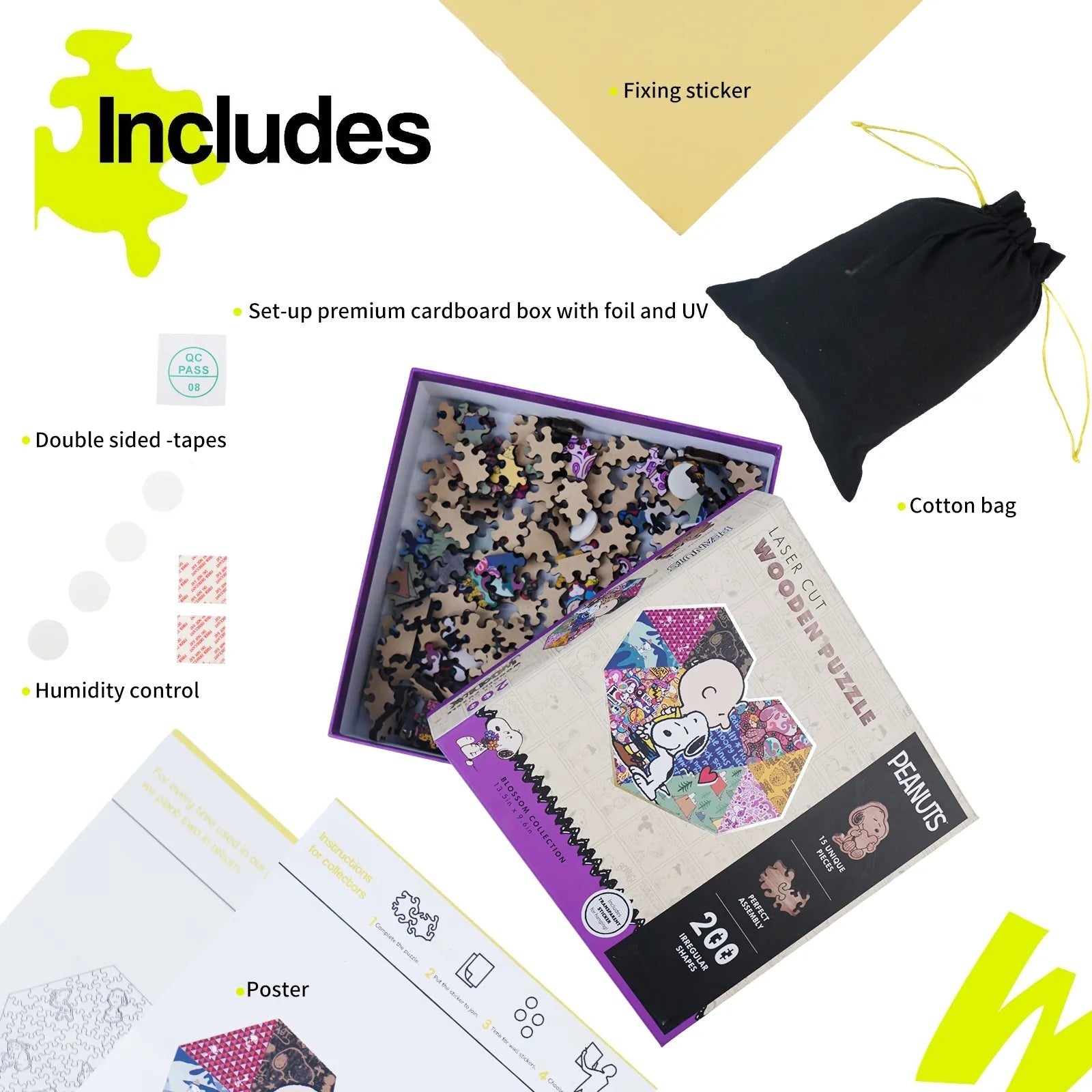 A wooden puzzle licensed from Peanuts. It features 200 irregular-shaped pieces cut with precision using laser, with a thickness of 5 mm for durability and a premium feel. The puzzle showcases a Snoopy special scene and includes 15 unique surprise shapes that add discovery and challenge. Sold as a gift suitable for families, Snoopy fans, or puzzle enthusiasts during holidays or birthdays, it emphasizes eco-friendly packaging and an accompanying cloth bag for storage and display. Overall, it highlights quality materials, intricate piece design, and collectible value.